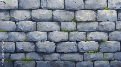 © Dzunstock, Fototapeta premium A textured stone wall with irregularly shaped stones, featuring patches of green grass growing between them.