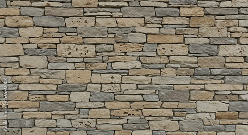 © nuyirdna, Fototapeta premium A textured wall composed of irregularly shaped lightcolored and gray natural stones forming a sturdy rustic surface