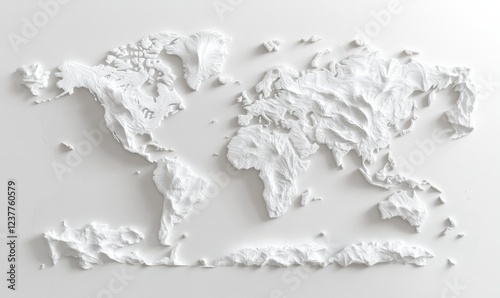Fototapeta premium A textured, white relief map of the world, showcasing continents and oceans in a minimalist design.