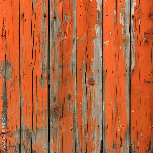 © DeepView, Fototapeta premium A textured wooden surface painted in orange with visible wear and weathering.