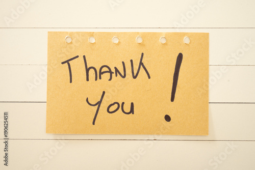 © Sonny, Obraz premium A thank you written on a sticky note. On a white wooden background.