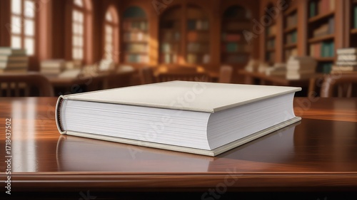 © SopnilJahan, Fototapeta premium A thick closed white book rests on a polished wooden table in a grand library with blurred bookshelves in the background