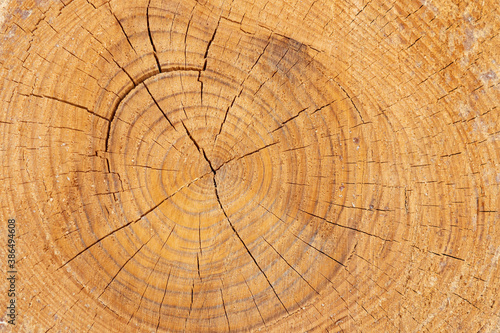 Fototapeta premium A thick tree trunk in a section with annual rings, cracks and resin drips....
