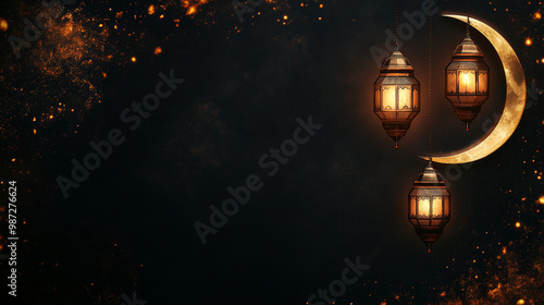 Obraz premium A thin black border with small hanging lanterns and crescent moons, beautiful...