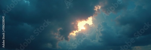 Fototapeta premium A thin sliver of light breaks through thick dark clouds forming a crescent shape on the horizon, stormy weather, cloudy