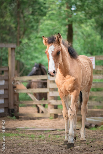 © shymar27, Obraz premium A thoroughbred horse runs around a forest farm.