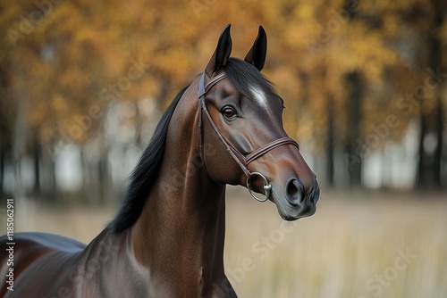 © Vitalii Shkurko, Fototapeta premium A thoroughbred horse stands gracefully, showcasing a glossy coat and attentive expression. The background features soft autumn colors, enhancing the tranquil atmosphere
