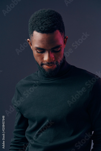 Fototapeta premium A thoughtful young African man in a black turtleneck sweater looking down against a dark gradient background, conveying introspection and calm emotions