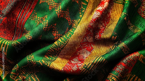 Fototapeta premium A three-colored cloth featuring red, yellow, and green hues, adorned with a red-yellow design atop a black-white bottom