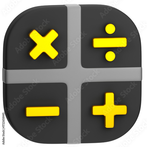 © oki, Fototapeta premium A three-dimensional, square icon depicts mathematical symbols in bright yellow against a dark gray background, conveying a user-friendly and straightforward digital interface.