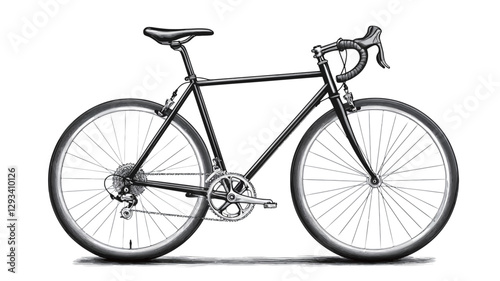 © LIHONG,YU, Obraz premium A three-quarter view of a black road bicycle is presented against a plain white background. The bicycle is depicted in a side profile, clearly showing its frame, wheels, handlebars, seat, pedals,
