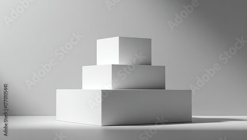 © andi, Fototapeta premium A three-tiered geometric display, rendered in white, under soft studio lighting