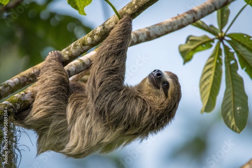 Fototapeta premium A three-toed sloth hangs upside down from a slender tree branch, its long,...