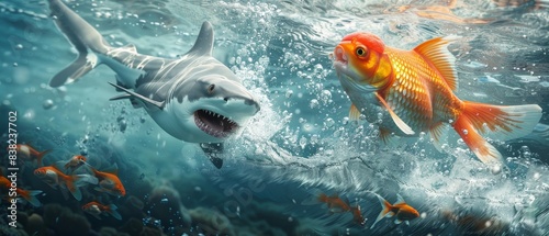 Naklejka premium A thrilling underwater chase between a menacing shark and a vibrant goldfish,...