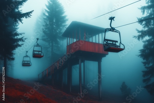 © Sanchai, Fototapeta premium A thrilling zip line ride through a foggy forest, with the mist creating an ethereal and mysterious atmosphere