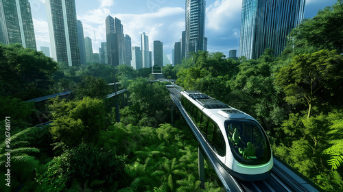 © Maksym, Naklejka premium A thriving urban area with eco-friendly skyscrapers, public parks, and green transportation options, all surrounded by lush vegetation