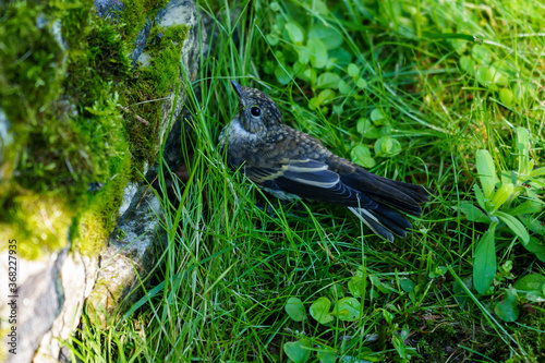 Obraz premium A thrush nestling that cannot fly tries to hide in the grass