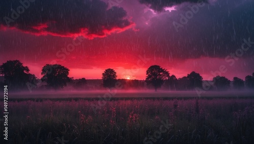 Fototapeta premium A thunderstorm occurring over a landscape with trees at sunset, illuminated by vibrant red and purple hues, with rain falling across the scene.