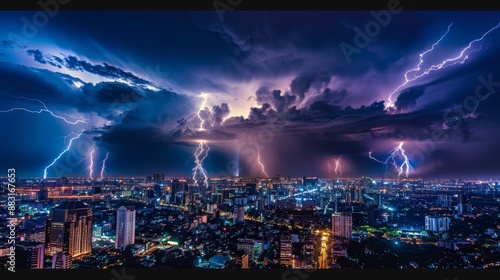 © jessica, Fototapeta premium a thunderstorm over a cityscape at nigh