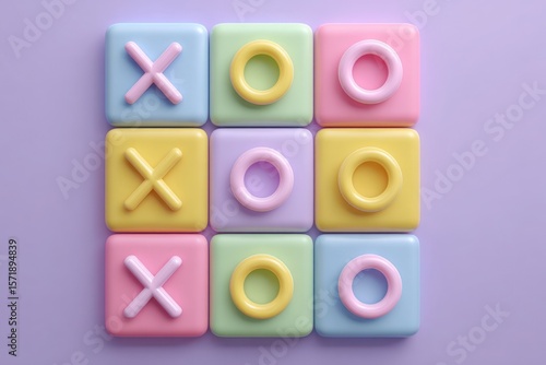 © AiHRG Design, Naklejka premium A tic-tac-toe game is displayed on a purple background. The board features pastel-colored squares with circular and X shapes, showcasing a playful design ideal for children.