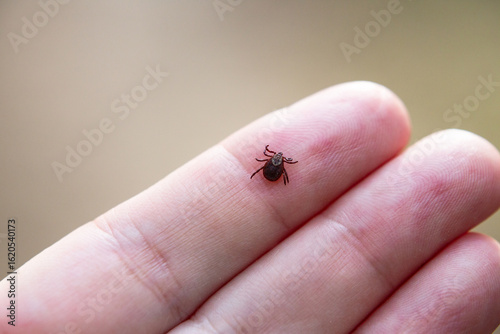 © Anna, Obraz premium a tick crawls mite on a person's arm, close-up, macro