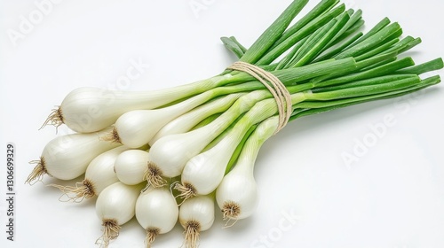© Gambar Upi, Obraz premium A tied bunch of fresh green onions on a white surface