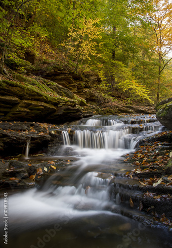 © rayhennessy, Fototapeta premium A tiered waterfall with in a forest with fall colors.