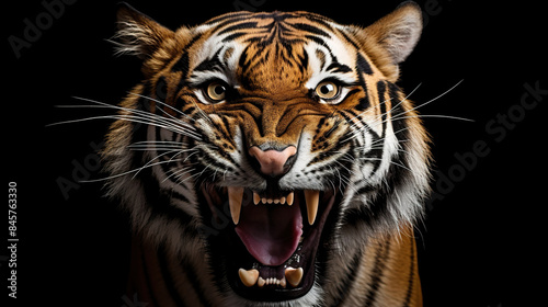 © Dilshad, Naklejka premium A tiger gaze with its mouth agape, isolated against a pitch-black background