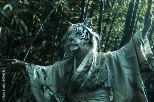 Fototapeta premium A tiger in a kimono is standing in front of a forest