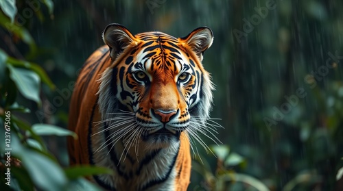 © hyperbleh, Obraz premium A tiger in the rain within a dense jungle setting