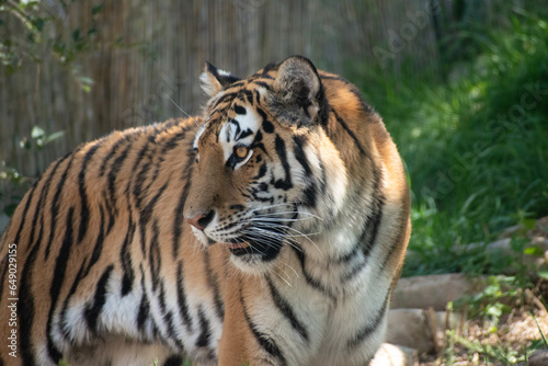 © JMP Traveler, Naklejka premium A tiger in the Utah Zoo Enclosure, with sun beams lighting up its striped fur coat.