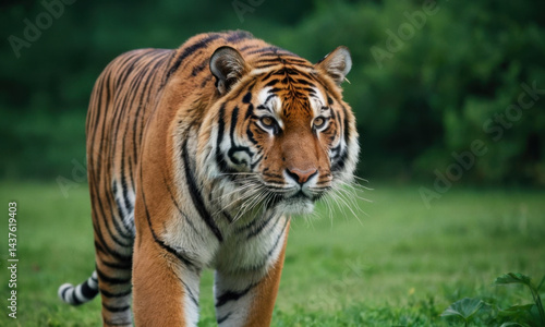 © Alena, Fototapeta premium A tiger is seen walking across a lush green field