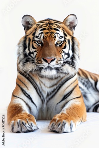 Obraz premium A tiger relaxes on a smooth white surface