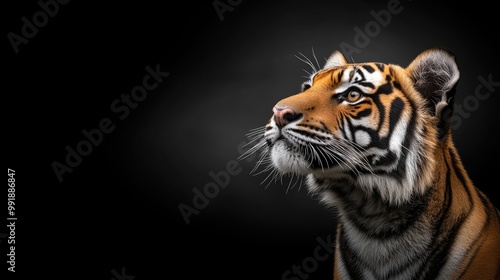 Naklejka premium A tiger rests gracefully, highlighted by a dark background that accentuates...