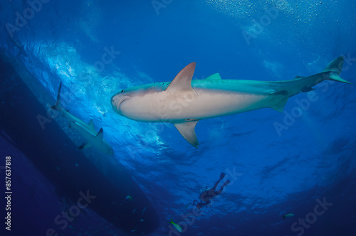 © scubagreg123, Fototapeta premium A tiger shark swimming underneath a boat