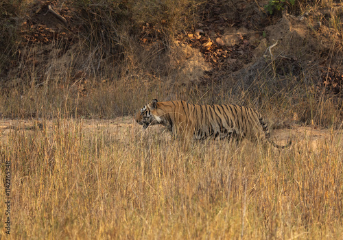 Fototapeta premium A tiger walking through the grassland of Bhandavgarh Tiger Reserve, Madhya pradesh, India
