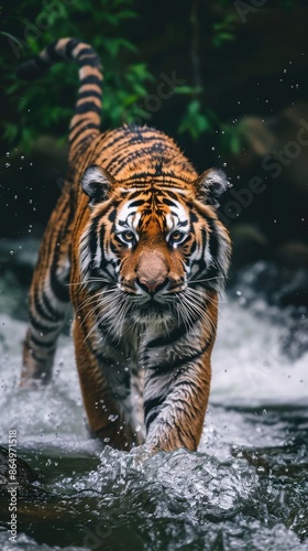 Naklejka premium A tiger walks through shallow water in a lush forest