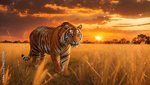 Naklejka premium A tiger with orange and black stripes is walking through a tall grassy