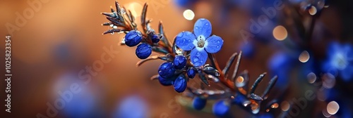 © Viktor, Fototapeta premium A tight shot of a blue bloom, adorned with dewdrops on its petals, against a softly blurred backdrop