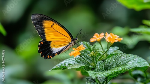 © Mikus, Fototapeta premium A tight shot of a butterfly atop an orange-flowered plant against a backdrop of green foliage