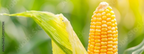 © Mikus, Obraz premium A tight shot of a corn cob against a sun-kissed backdrop, grassy surroundings softly blurred