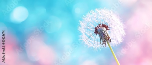 © Mikus, Obraz premium A tight shot of a dandelion against a softly blurred backdrop of blue and pink, with an indistinct, hazy sky above