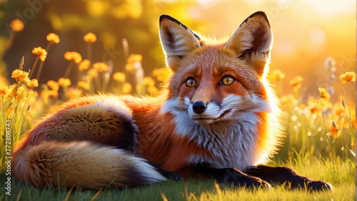 © Janis, Obraz premium A tight shot of a fox reclining in a meadow, surrounded by yellow flowers, while the background softly blurs