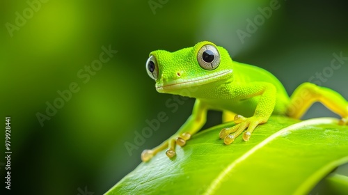 Naklejka premium A tight shot of a frog atop a leaf against softly blurred green foliage...