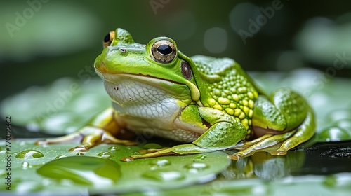 © Wall, Fototapeta premium A tight shot of a frog atop a wet leaf, speckled with water droplets, against an indistinct backdrop