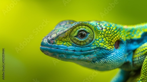 © Viktor, Fototapeta premium A tight shot of a green-blue lizard's face, background softly blurred