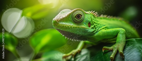 Obraz premium A tight shot of a green chameleon perched on a leafy branch against a...
