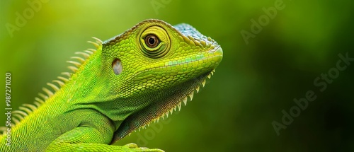 © Wall, Obraz premium A tight shot of a green iguana perched on a branch against a softly blurred backdrop of green foliage