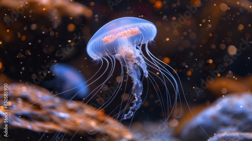 Fototapeta premium A tight shot of a jellyfish hovering above clear water, surrounded by bubbles...