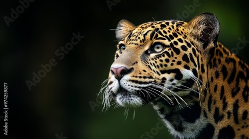 © Wall, Obraz premium A tight shot of a leopard's face against a blurred backdrop of trees